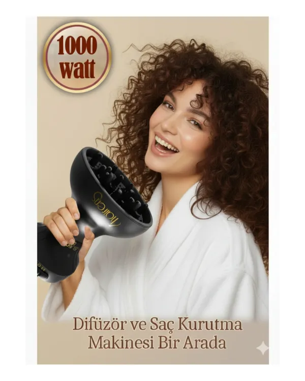 - 1000W motor gücü ile saçları nazik, ısı yıpratmadan kurutur.