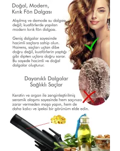 - Hairens saç dalgalandırıcı kırık fön aparatı fırçasız bir şekilde dalgalandırır, saçlarınız fırçanın oluşturduğu darbelerden kırılmaz. Kırık fön yaptırırken elde ettiğiniz dalganın aynısını fırça kullanmadan, saçlarınızı kırmadan gerçekleştirebilirsiniz.
